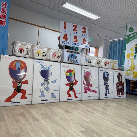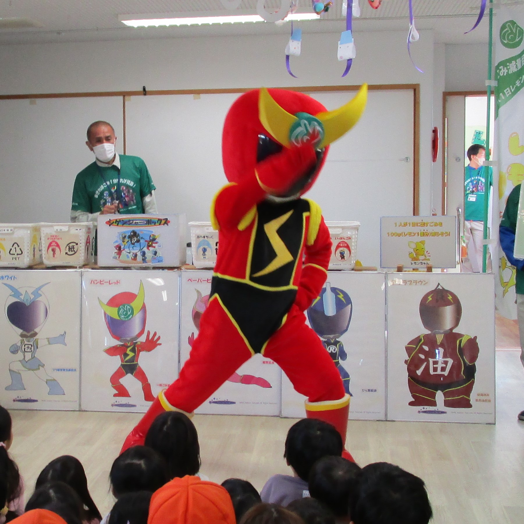 市役所の環境事業所の方とシゲンジャー(パンピーレッド)が来てくれてゴミの分別やリサイクルについて教えてもらいました