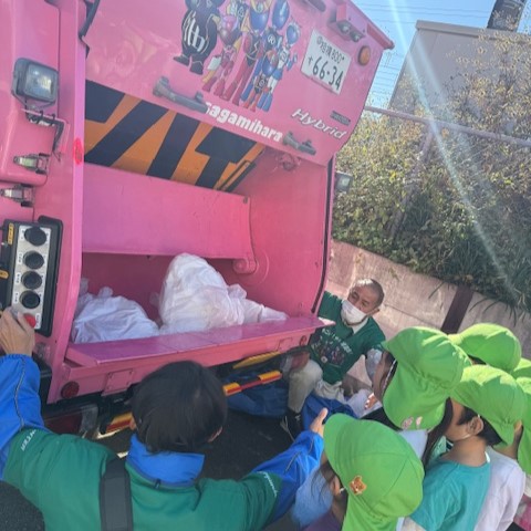 室内の話が終わると年長のみ更に詳しくお話を聞いたり、収集車にゴミを入れる体験をしました